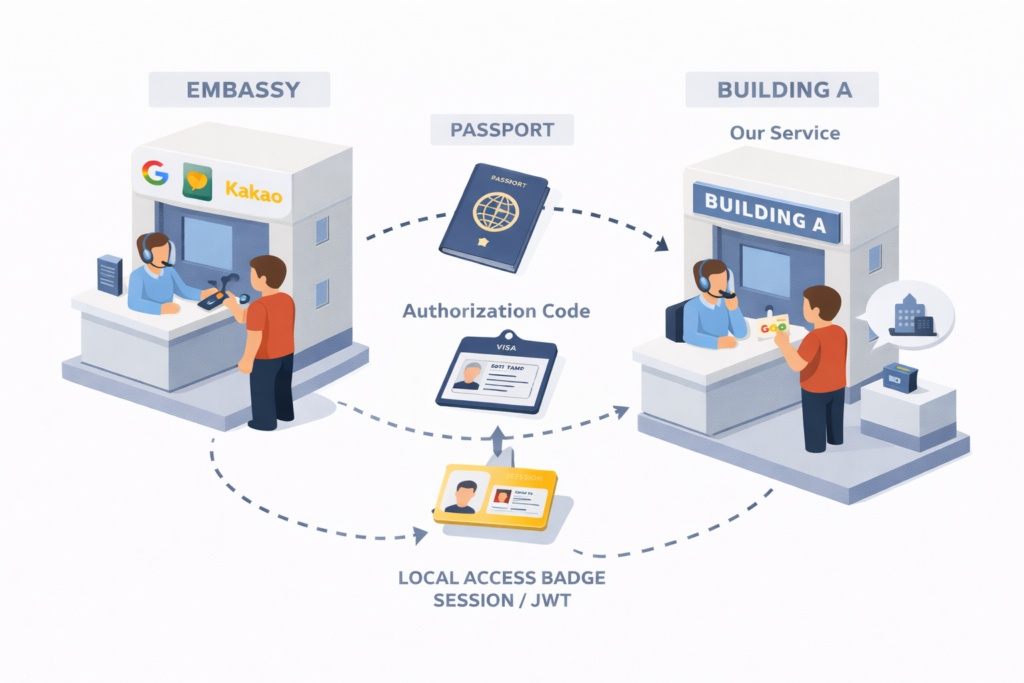 OAuth2는 대사관(Google)에서 비자를 받아오는 것이다. 우리 서버는 비밀번호를 전혀 모른다.