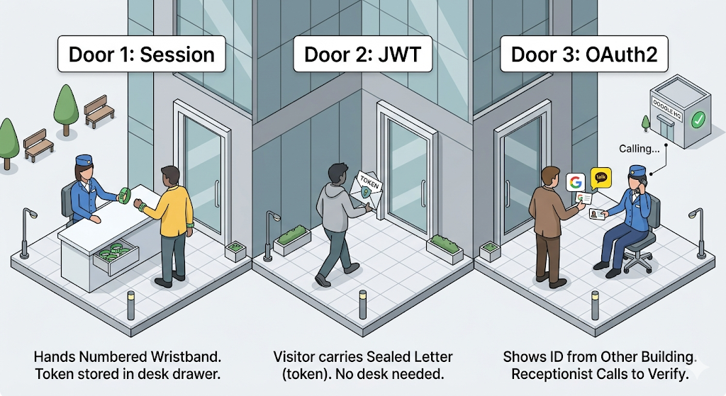 세션은 서버가 기억하고, JWT는 클라이언트가 들고 다니고, OAuth2는 남의 신분증을 빌린다.