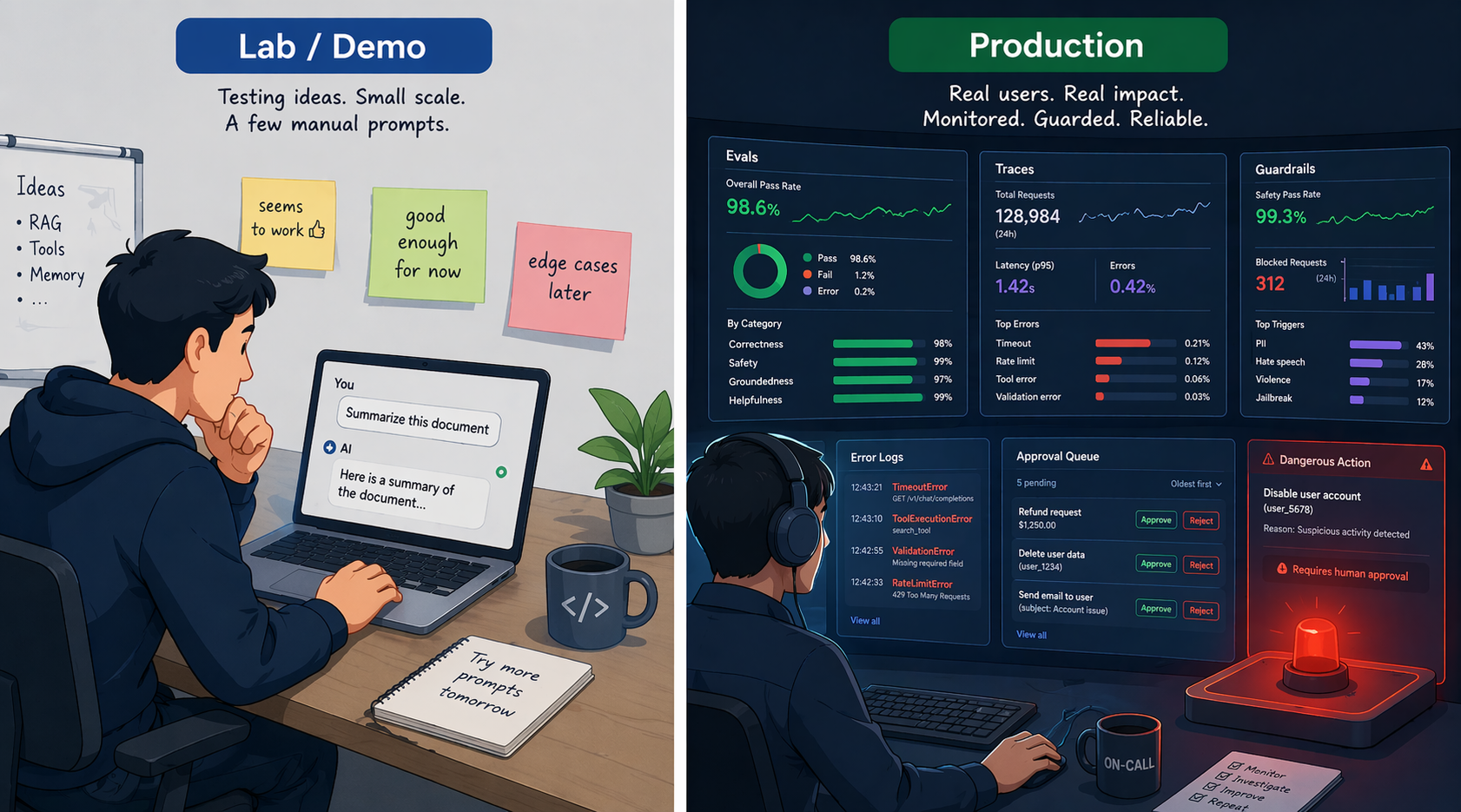 프롬프트를 다듬고, 도구를 붙이고, RAG를 연결하고, 에이전트 루프까지 돌려봤다. 데모에서는 멋지게 동작한다. 그런데 이걸 실제 서비스로 올리려고 하면 갑자기 막막해진다.