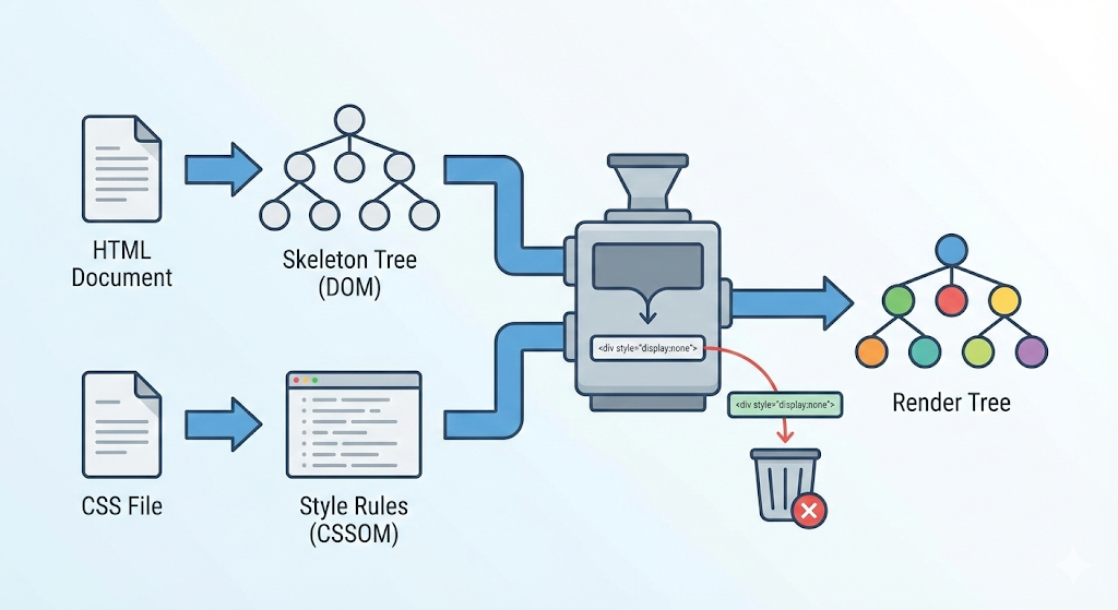 이제 뼈대(DOM)와 디자인(CSSOM)을 합친다. 여기서 중요한 점은 ‘실제로 화면에 보일 것들’만 추려낸다는 것이다.
