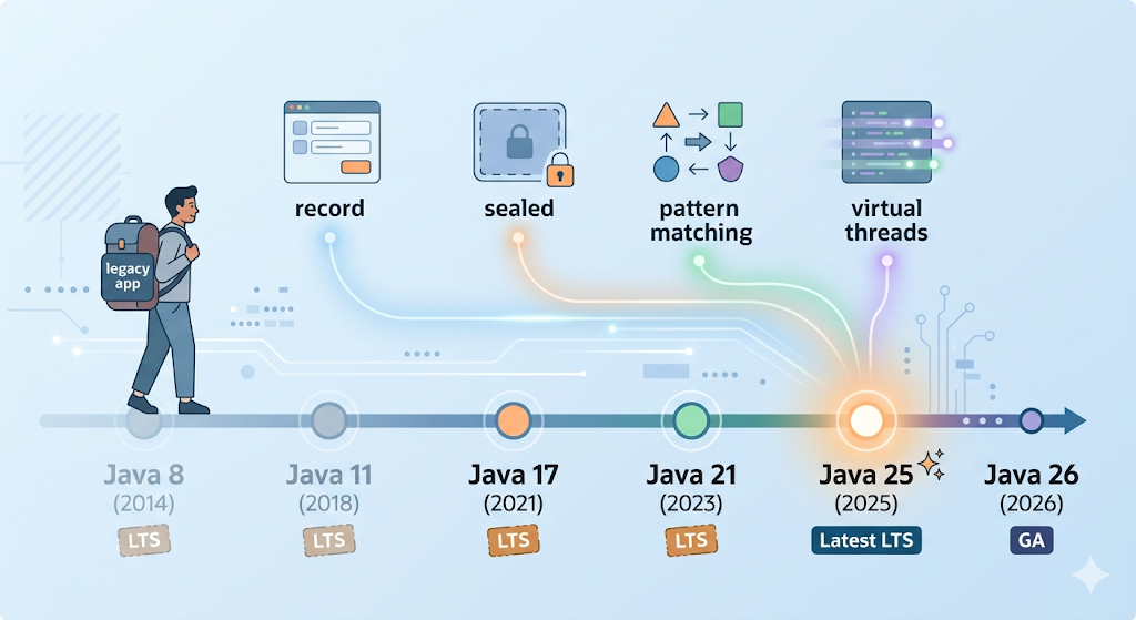 Java 8에 머문 팀을 위한 Java 25 LTS 가이드. record, sealed, pattern matching, virtual threads의 실무 영향과 단계적 마이그레이션 경로, 한국 SI/전자정부프레임워크 맥락까지 정리합니다.