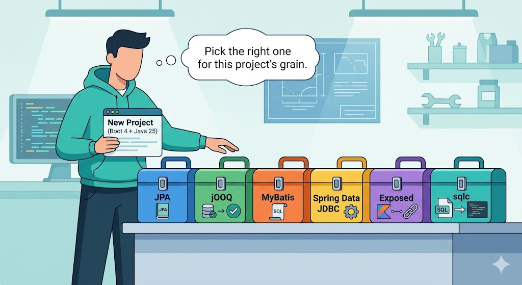 Spring Boot 4 시대의 SQL 접근 기술 선택 가이드. JPA, jOOQ, MyBatis, Spring Data JDBC, Exposed 1.0을 프로젝트 결에 맞춰 정리하고, MyBatis와 jOOQ 사이의 판단을 SI 현실까지 반영해 본다.