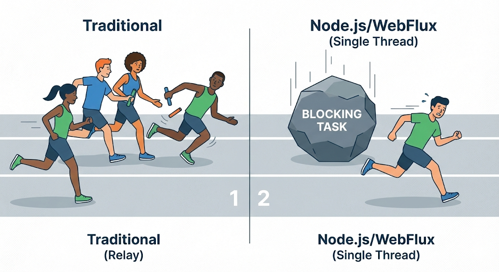 최근에는 이 문제를 해결하기 위해 Node.js나 스프링의 WebFlux 같은 비동기(Non-blocking) 기술들이 주목받고 있다. 얘네들은 “스레드를 늘리지 말고, 한 명이 쉬지 않고 빠르게 처리하자”는 전략을 쓴다.