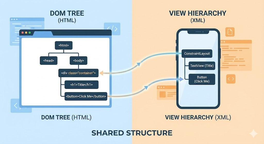 Nur die Tag-Namen waren anders. Die Struktur – „Kind-Elemente in ein Eltern-Element packen und mit Attributen das Layout bestimmen“ – war exakt dieselbe wie in HTML. Da ich den DOM-Tree und das Box-Modell verstanden hatte, konnte ich auch das Android-Layout schnell meistern.