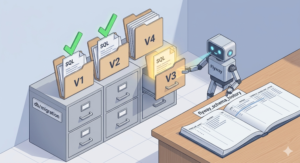Flyway는 버전 번호 순서대로 마이그레이션을 실행한다. 이미 실행된 버전은 건너뛴다. flyway_schema_history 테이블에 실행 이력이 기록된다.