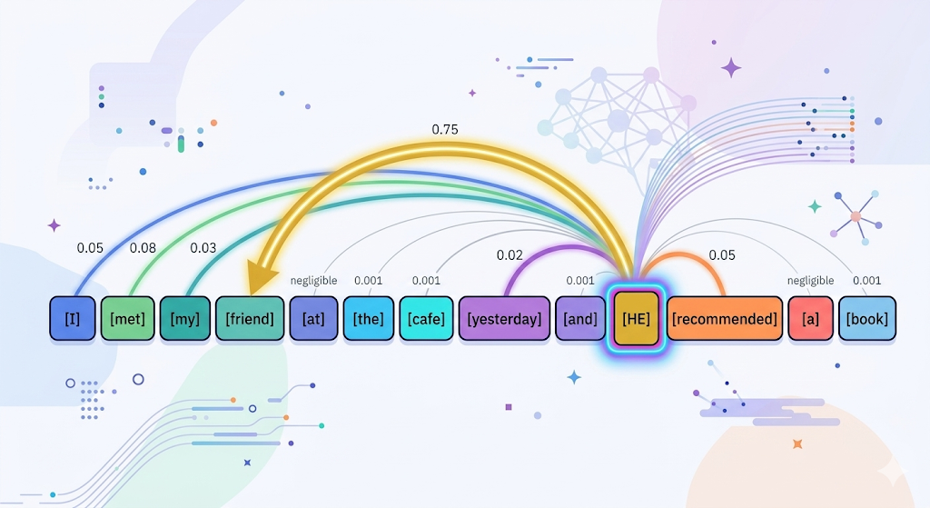 입력: "나는 어제 카페에서 친구를 만나서 그와 커피를 마셨다" '그와'라는 토큰을 처리할 때, Transformer는 모든 토큰을 동시에 보고 가중치를 매긴다: 나는 : 0.05 어제 : 0.02 카페에서 : 0.03 친구를 : 0.75 ← 가장 관련이 높은 토큰! 만나서 : 0.05 ... → '그와'는 '친구를'을 가리킨다고 판단