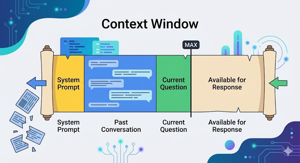 이 한계 안에는 ‘시스템 프롬프트, 이전 대화, 현재 질문, 그리고 생성 중인 답변’이 모두 포함된다. 코딩 도구라면 여기에 ‘프로젝트 코드’까지 들어간다.