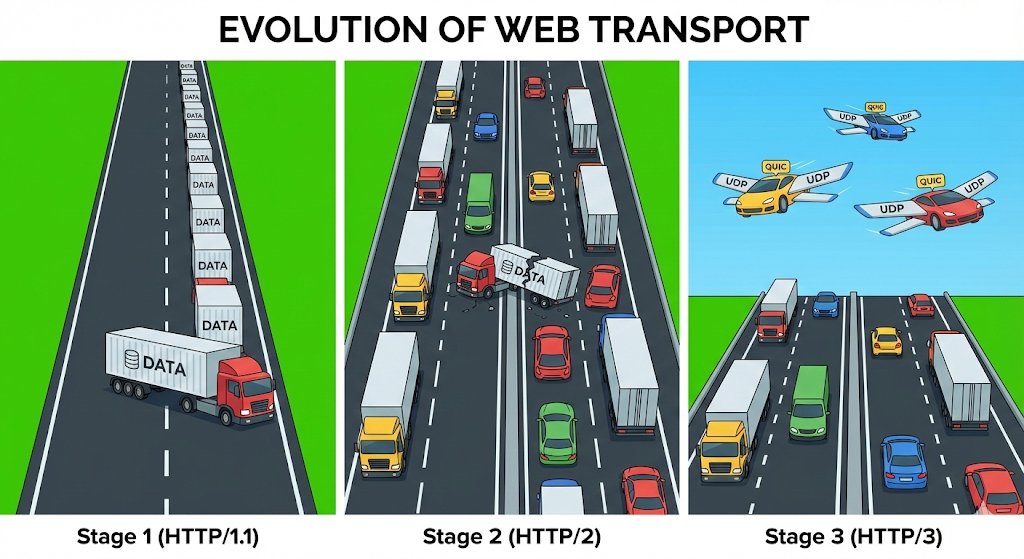 최근 면접 질문으로도 자주 나오는 HTTP/3가 바로 이 Trade-off의 산물이다. 우리가 쓰는 인터넷(HTTP/1.1, HTTP/2)은 그동안 TCP 위에서 돌아갔다. 데이터가 절대 깨지면 안 되니까.