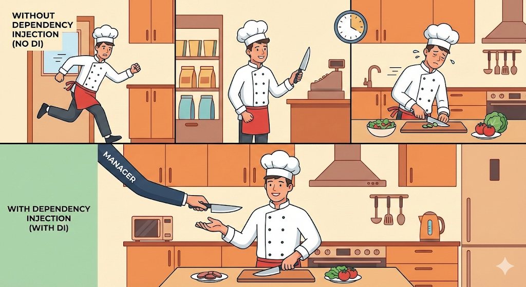 - DI (Dependency Injection): 매니저가 내 손에 칼을 쥐여준다(Inject). 오늘은 일식도를 줄 수도 있고, 내일은 중식도를 줄 수도 있다.