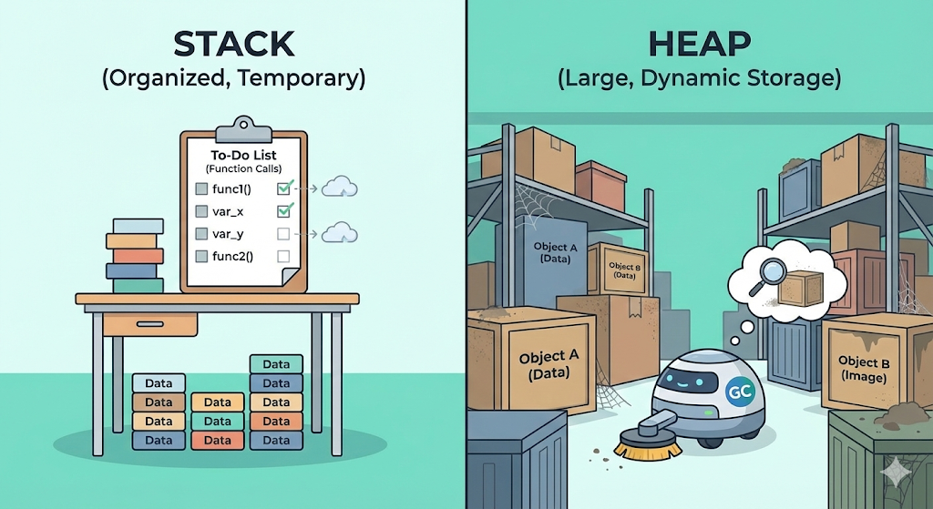 C언어 같은 옛날 언어는 개발자가 직접 free()라는 명령어로 청소를 해야 했다. 까먹으면 창고가 쓰레기로 가득 차서 터진다(메모리 누수). 반면 자바(Java), 파이썬(Python), 자바스크립트(JS) 같은 현대 언어는 ‘GC(Garbage Collector)’라는 전문 청소부를 고용했다.