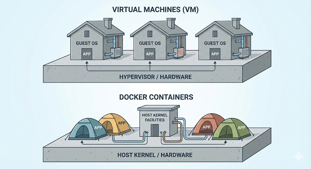 그래서 등장한 것이 ‘도커(Docker)’, 즉 ‘컨테이너(Container)’ 기술이다. 도커는 VM처럼 집을 통째로 짓지 않는다. 대신 ‘텐트’를 친다.