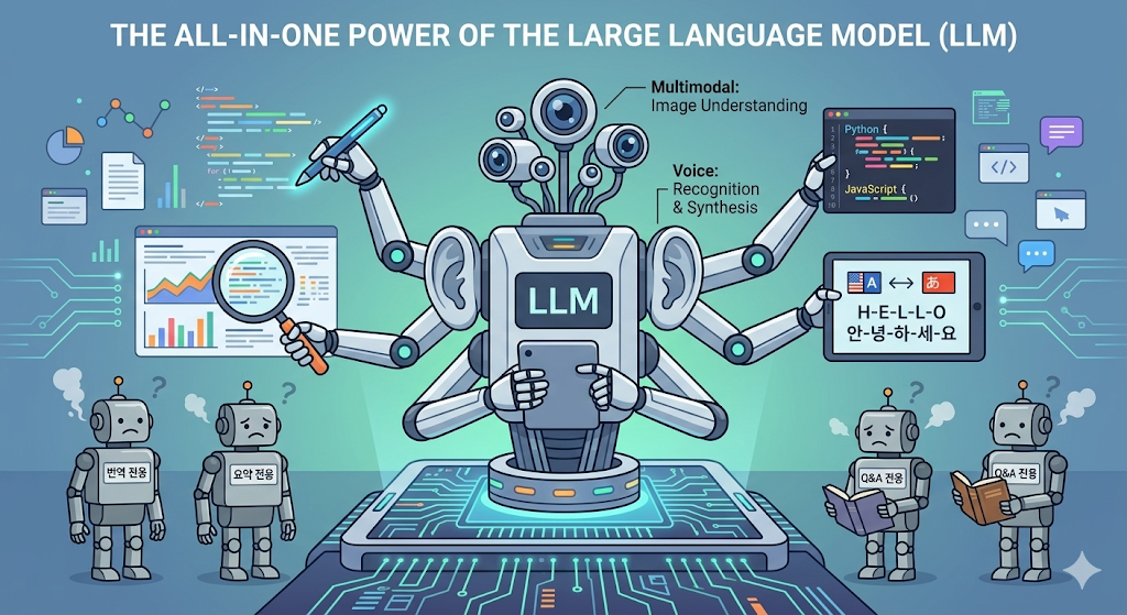 예전에는 번역을 위한 AI, 요약을 위한 AI, 챗봇 AI를 각각 따로 만들어야 했다. 하지만 ChatGPT 같은 LLM은 하나의 모델로 번역, 요약, 질의응답, 글쓰기, 코딩을 모두 할 수 있다. 이것이 LLM이 “범용 AI”에 가장 가까운 존재로 주목받는 이유다.
