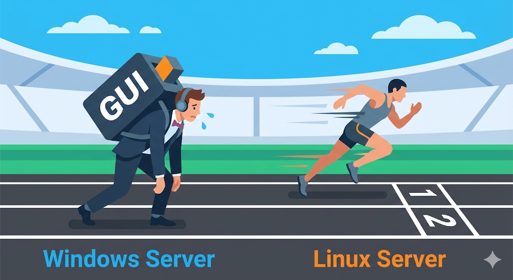 윈도우를 부팅하면 바탕화면이 뜨고, 아이콘이 보이고, 마우스 커서가 움직인다. 이 화려한 그래픽(GUI)을 유지하기 위해 컴퓨터는 끊임없이 CPU와 메모리를 쓴다. 하지만 서버는 모니터가 필요 없다. 지구 반대편 어딘가 처박혀서 오직 ‘데이터 처리’만 하면 된다. 리눅스 서버(CLI)는 그래픽을 싹 걷어내고 오직 텍스트만 남겼다. 윈도우가 100의 힘 중 30을 화면 그리는 데 쓴다면, 리눅스는 100을 온전히 서비스에 쏟아붓는다.