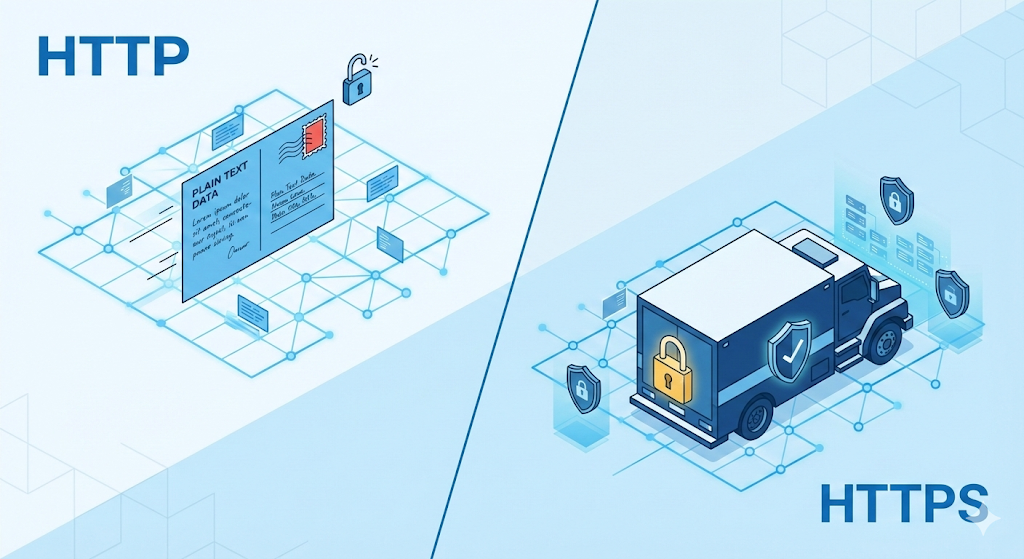 2. SSL (Secure Sockets Layer) = 배송 트럭의 자물쇠 과거의 웹(HTTP)은 엽서와 같았다. 우체부(해커)가 마음만 먹으면 내용을 훔쳐볼 수 있었다. SSL을 적용한 웹(HTTPS)은 봉인된 금고 트럭이다. 출발지에서 목적지까지 데이터가 암호화되어 이동하므로, 중간에 누가 가로채더라도 내용을 알 수 없다. 주소창의 자물쇠 아이콘은 “이 트럭은 안전합니다”라는 보증수표다.