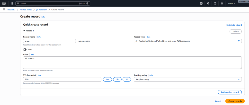 - 구매한 도메인 클릭 후 ‘레코드 생성(Create record)’ 버튼 클릭